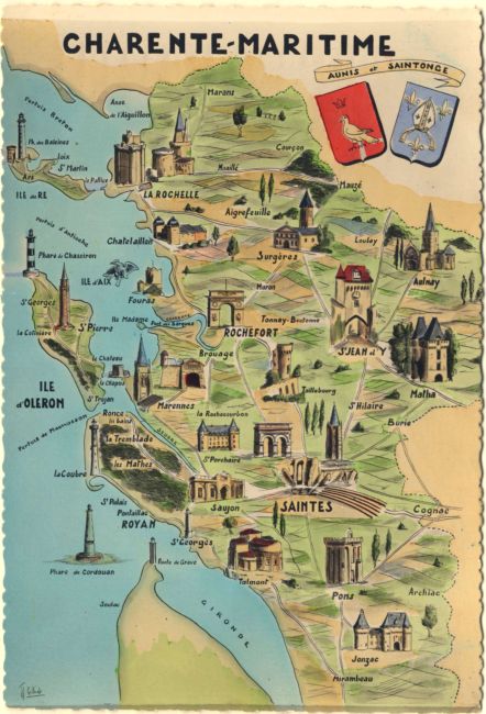 La Roche-Courbon, 6 vues et blasons Aunis et Saintonge, fond jaune Gilbert - 17.LR.6 1955-1965. Cls, 15x10 |